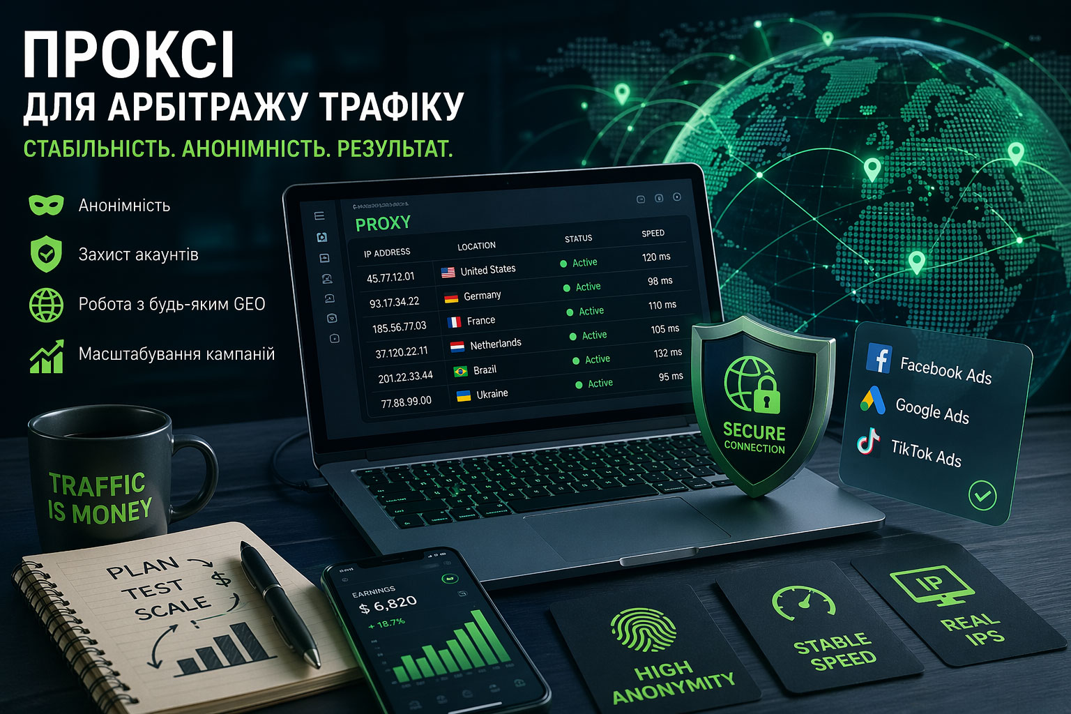 Проксі для арбітражу трафіку: як обрати та ефективно використовувати у 2026 роціАрбітраж трафіку стрімко розвивається, і разом із ним зростають вимоги до інструментів, які забезпечують стабільність, анонімність та масштабування рекламних кампаній. Одним із ключових елементів інфраструктури арбітражника залишаються проксі-сервери. Саме вони дозволяють обходити обмеження рекламних платформ, працювати з різними геолокаціями та мінімізувати ризики блокувань. Що таке проксі та чому вони важливі для арбітражуПроксі-сервер — це проміжна ланка між користувачем і сайтом або сервісом. У контексті арбітражу трафіку він дозволяє підміняти IP-адресу, маскувати реальне місцезнаходження та працювати з декількома акаунтами одночасно. У першій половині стратегії запуску рекламних кампаній арбітражники часто використовують проксі для арбітражу, щоб уникнути підозрілої активності з боку рекламних платформ. Це особливо актуально при роботі з Facebook Ads, Google Ads, TikTok та іншими джерелами трафіку, які активно борються з мультиакаунтингом. Основні типи проксі для арбітражуРезидентські проксіНайбільш популярний варіант серед професіоналів. Вони використовують IP-адреси реальних користувачів, що робить трафік максимально «природним» в очах систем модерації. Мобільні проксіПрацюють через мобільні оператори та мають високий рівень довіри. Ідеально підходять для масштабних кампаній, але можуть бути дорожчими. Дата-центр проксіБільш доступні за ціною, проте менш надійні. Часто використовуються для тестування зв’язок або допоміжних задач. Як обрати проксі для арбітражуПравильний вибір проксі напряму впливає на результативність рекламних кампаній. Експерти рекомендують звертати увагу на такі параметри: