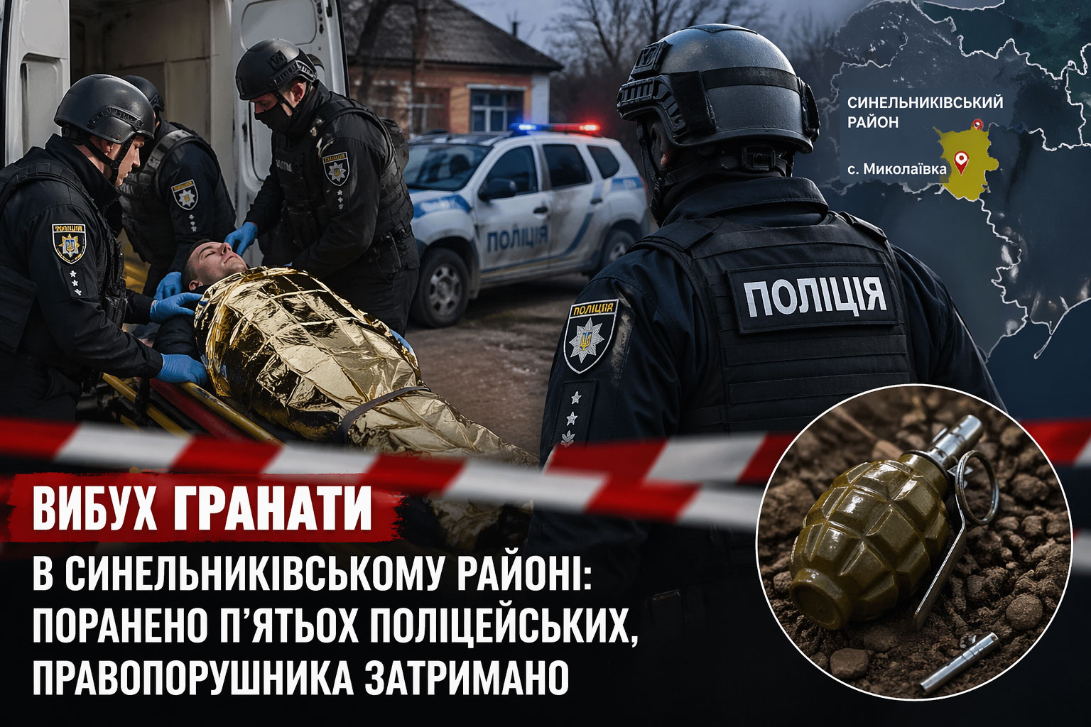 Взрыв гранаты в Синельниковском районе: ранены полицейские, нападавший задержанЧП в Днепропетровской области: что произошлоРанним утром 21 апреля в одном из сел Синельниковского района Днепропетровской области произошёл опасный инцидент с применением взрывного устройства. В результате — пятеро сотрудников полиции получили ранения, а подозреваемый был задержан на месте. По информации правоохранителей, около 06:30 на линию полиции поступило анонимное сообщение о неадекватном поведении местного жителя в селе Николаевка. Заявитель сообщил, что мужчина находится в состоянии сильного алкогольного опьянения и угрожает окружающим, утверждая, что у него есть гранаты. Угроза взрыва: мужчина открыл газ и угрожал гранатамиПрибывшие на место сотрудники полиции начали переговоры с нарушителем. В ходе общения мужчина заявил, что открыл подачу газа в доме, тем самым создав потенциальную угрозу масштабного взрыва, который мог затронуть соседние дома. По словам источников в правоохранительных органах, ситуация требовала немедленного реагирования, так как существовал риск гибели мирных жителей.