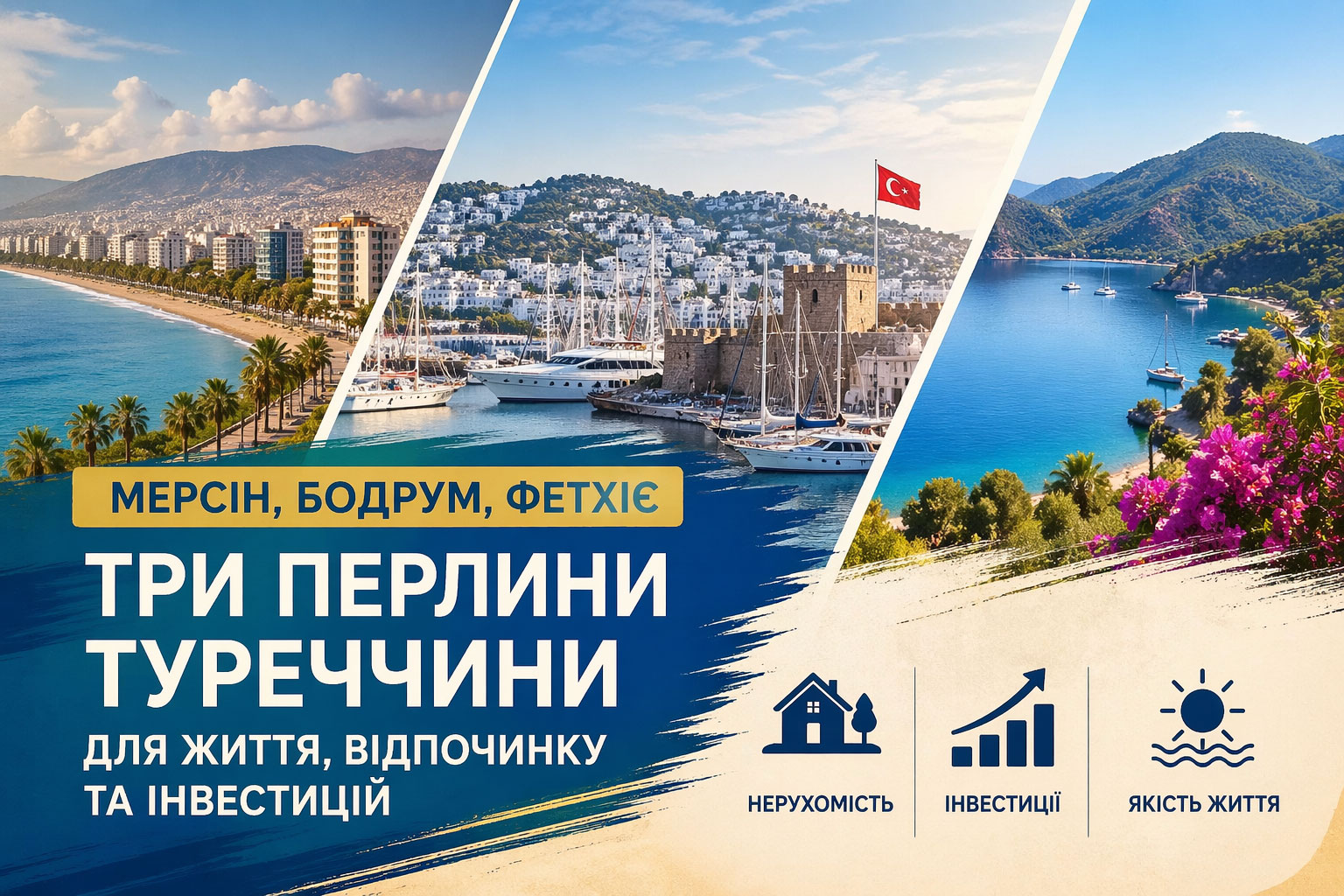 Туреччина, що закохує: Мерсін, Бодрум і Фетхіє як нові центри життя, відпочинку та інвестиційВступ: трансформація туристичної країни у простір для життяСучасна Туреччина вже давно перестала асоціюватися виключно з пакетним туризмом. За останнє десятиліття країна активно розвиває інфраструктуру, житловий сектор і міжнародну привабливість. У 2024–2025 роках Туреччина стабільно входить у топ-5 країн за кількістю угод купівлі нерухомості іноземцями. Це пояснюється не лише кліматом, а й доступними цінами, спрощеними умовами придбання та можливістю отримання посвідки на проживання. Особливу увагу інвесторів і покупців привертають три регіони — Мерсін, Бодрум та Фетхіє. Кожен із них має власну унікальну економіку, атмосферу та перспективи. Новий погляд на турецьке узбережжяТуреччина давно вийшла за межі формату «все включено». Сьогодні вона перетворюється на повноцінний центр для життя, інвестицій і віддаленої роботи. Особливо це помітно в таких регіонах, як Мерсін, Бодрум та Фетхіє — містах, які поєднують клімат, інфраструктуру та вигідні можливості для придбання житла. За даними Турецького статистичного інституту (TÜİK), у 2024 році іноземці придбали понад 35 000 об’єктів нерухомості в країні. При цьому значна частка припадає саме на курортні регіони Егейського та Середземного морів. Мерсін: новий інвестиційний магніт Середземномор’яЕкономічне зростання і перспективиМерсін сьогодні — це один із найдинамічніших ринків нерухомості в Туреччині. За останні 3 роки ціни на житло тут зросли приблизно на 60–80%, але залишаються значно нижчими, ніж у популярних туристичних центрах. Ключовим драйвером розвитку є будівництво міжнародного аеропорту Чукурова, який зможе обслуговувати до 9 млн пасажирів щорічно. Це відкриває регіон для масового туризму та бізнесу. Переваги для покупців