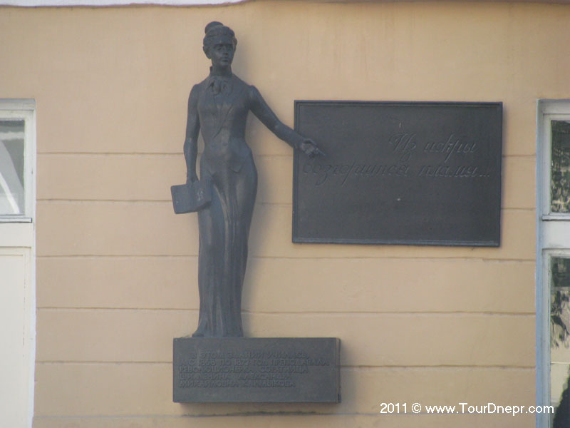 Памятники ДнепропетровскаПамятник А. М. Калмыковой в Днепропетровскег. ДнепропетровскПамятник Александре Михайловне Калмыковой установлен на фасаде бывшей Мариинской женской гимназии (гимназия № 33), где она училась и получила диплом педагога, а в 1868–1872 гг. преподавала. Александра Михайловна Калмыкова (1849–1926 гг.) - соратница В. И. Ленина, известная общественная деятельница в сфере развития народного образования. В Харькове Александра Михайловна Калмыкова примкнула к кружку, группировавшемуся вокруг только что возникшего и тогда ещё прогрессивного «Южного края», в котором поместила ряд статей. Калмыкова А.М. принимала участие в занятиях женской воскресной школы и известной книги «Что читать народу» составила разделы по географии и истории. С 1885 года, переехав в Санкт-Петербург, А.М. Калмыкова взяла на себя преподавание в воскресной школе Фарфоровского попечительства по Шлиссельбургскому тракту. В 1889-1902 года в Петербурге держала книжный склад популярной литературы, который служил явкой для социал-демократов, оказывала материальную помощь изданию ленинской «Искры» и «Зари». Изданный в 1890 году каталог склада Калмыковой Александры Михайловны представлял собой хорошее пособие для составления школьных и народных библиотек. В то же время Калмыкова издает ею же составляемые две серии дешевых книг для народа, под заглавием: «Жизнь прежде и теперь» и «Силы природы и труд человека». Кроме того, Калмыкова поместила несколько статей в «Русской школе» 1890-1893 гг. В 1902 году Александра Михайловна Калмыкова была выслана за границу. Она оказывала огромную финансовую помощь большевикам. После Октябрьской революции 1917 года работала в органах народного образования и Педагогическом институте им. К. Д. Ушинского в Ленинграде. Умерла Калмыкова Александра Михайловна 1 апреля 1926 года в Ленинграде. |